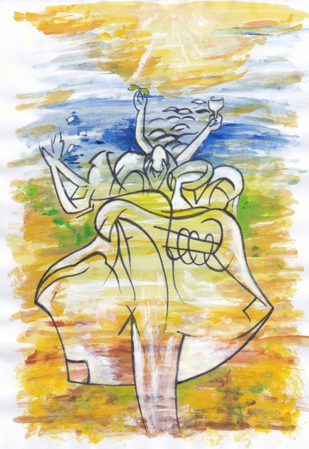 En Wijn als keuze symbool voor de roes of de heiliging en vreugde.