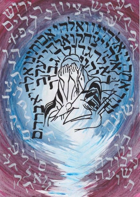 De tekening laat het Amida / Achtien Gebed zien. Het zijn oeroude woorden uitgesproken door vele generaties voor ons. Het Amida wordt ook wel het stille Gebed genoemd. Mijn Leermeester zei je fluistert de woorden, alsof je vertrouwelijk met iemand praat. Wat mooi als je je de vertrouweling van de Eeuwige kan voelen. Geïnspireerde woorden….