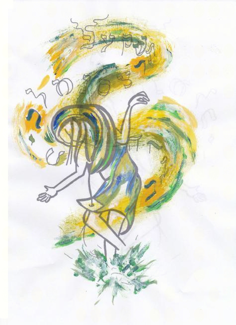 Het verhaal heeft veel gemeen met de tekening. De vrouw kan de gebeden niet uitspreken. Ze lijkt op mijn vrouw, ook zij kent het Hebreeuws niet. Maar als ik tijdens Jom Kippoer naar boven kijk kon het wel eens zo zijn dat dankzij haar de hemelpoort even opengaat. Daarom danst zij hier de letters, zij kent de gebeden niet maar danst iedere letter zodat ze er boven gebeden van kunnen maken. Het gaat niet om wat je zegt maar om wat je doet, je hele leven een gebed. De manier waarop de vrouw getekend is is in de vorm van de letter Alef. De andere letters volgen waarbij de letters onderin nog in de juiste volgorde staan maar boven begint dit al te verschuiven om straks in de andere wereld als gebed aan te komen…