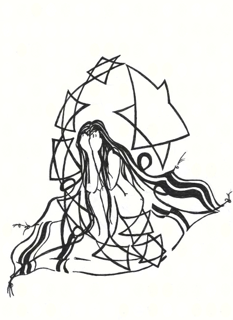Mijn eerste serieuze tekening. Over deze heb ik het langste nagedacht. Steeds weer veranderde in mijn hoofd hoe het er uit moest zien. Wat het op dat moment voorstelde wist ik toen nog niet en nu kan ik er enkel maar naar gissen. In ieder geval zat deze tekening diep in mij en is de reden dat er daarna nog vele volgde.